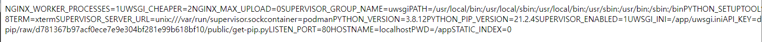 NGINX_WORKER_PROCESSES=1UWSGI_CHEAPER=2NGINX_MAX_UPLOAD=0SUPERVISOR_GROUP_NAME=uwsgiPATH=/usr/local/bin:/usr/local/sbin:/usr/local/bin:/usr/sbin:/usr/bin:/sbin:/binPYTHON_SETUPTOOLS_VERSION=57.5.0UWSGI_PROCESSES=16port=80LANG=C.UTF-8TERM=xtermSUPERVISOR_SERVER_URL=unix:///var/run/supervisor.sockcontainer=podmanPYTHON_VERSION=3.8.12PYTHON_PIP_VERSION=21.2.4SUPERVISOR_ENABLED=1UWSGI_INI=/app/uwsgi.iniAPI_KEY=d22cb18e86fc9e23996650150461c9f794ad3a4fHOME=/rootSTATIC_PATH=/app/staticGPG_KEY=E3FF2839C048B25C084DEBE9B26995E310250568PYTHONPATH=/appSTATIC_URL=/staticSUPERVISOR_PROCESS_NAME=uwsgiPYTHON_GET_PIP_SHA256=01249aa3e58ffb3e1686b7141b4e9aac4d398ef4ac3012ed9dff8dd9f685ffe0PYTHON_GET_PIP_URL=https://github.com/pypa/get-pip/raw/d781367b97acf0ece7e9e304bf281e99b618bf10/public/get-pip.pyLISTEN_PORT=80HOSTNAME=localhostPWD=/appSTATIC_INDEX=0