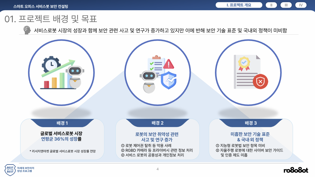 프로젝트 개요 | 차세대 보안리더양성 프로그램 (BoB)의 2차 교육 팀프로젝트. IoT 및 서비스로봇의 취약성에 대응하고자 국내 대기업(L사)의 서비스로봇 시스템 취약점 진단 및 정책 제안을 수행함.