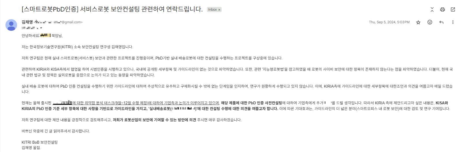 서비스로봇의 보안에 대한 가이드라인은 어디에도 찾아볼 수 없었다. 게다가 우리는 서비스로봇의 개인정보 범위까지도 다루려고 하였는데, IoT에서의 개인정보가 뭐가 있을까 보다가 PbD라는 개념과 인증제도에 대하여 찾을 수 있었다. 담당 기관이 KISA여서, KISA에 관련한 정보에 대하여 여쭙고 가이드라인 제작 여부에 대하여 여쭙고자 컨택을 하였다.