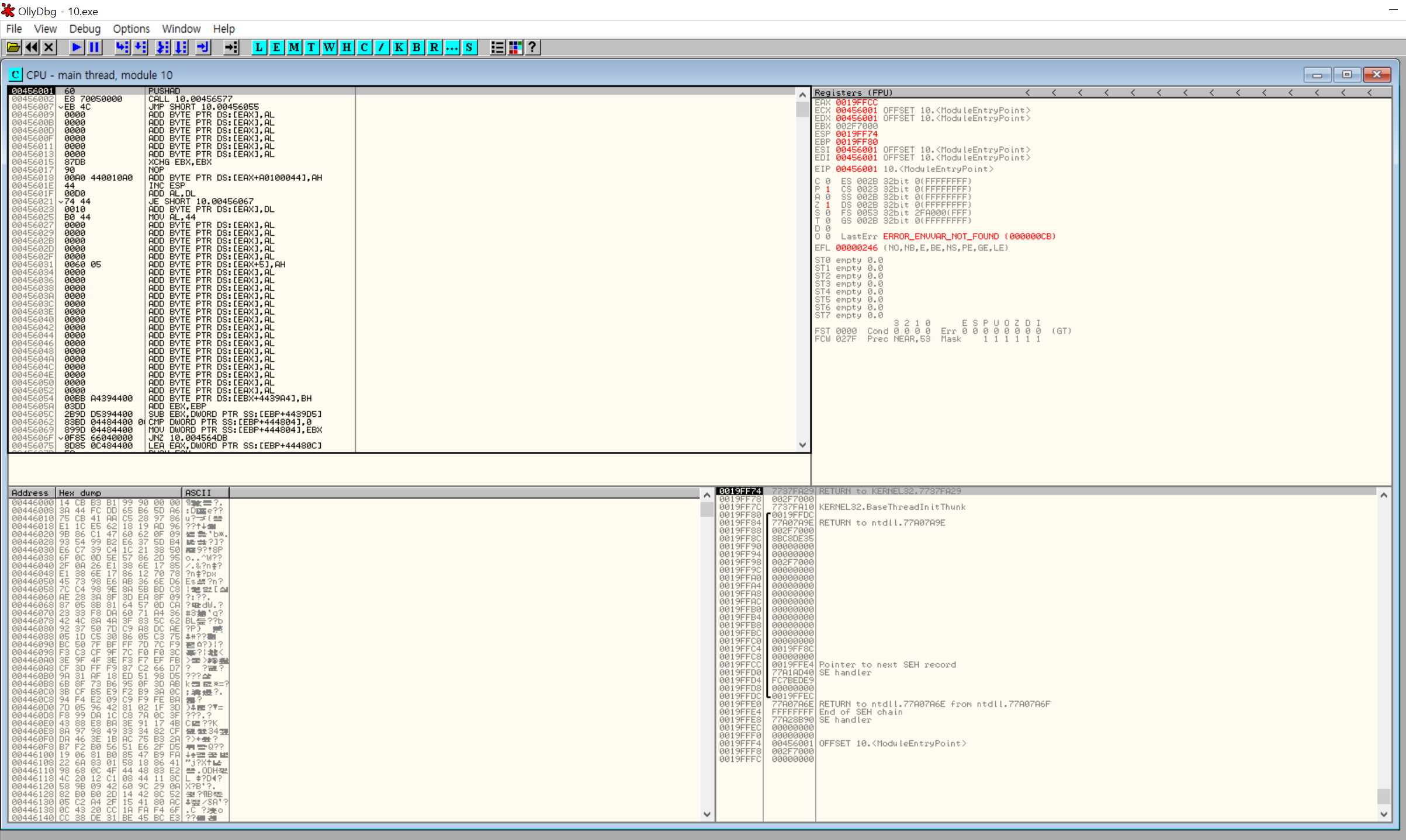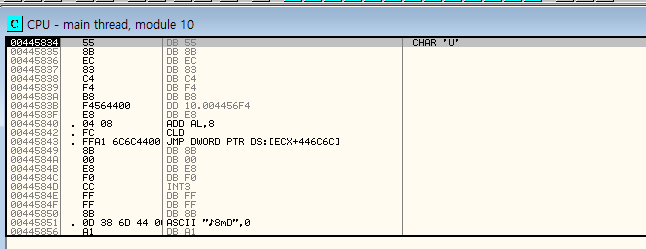 F8 3번, ctrl+A 를 눌러서 EOP가 00445834임을 알 수 있다..