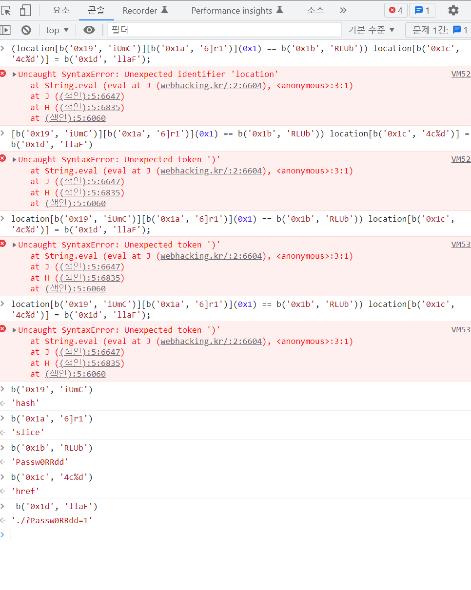 else문에서 경고가 떴으니 그 반대인 (location[b('0x19', 'iUmC')][b('0x1a', '6]r1')](0x1) == b('0x1b', 'RLUb')) location[b('0x1c', '4c%d')] = b('0x1d', 'llaF'); 코드를 콘솔창에 입력