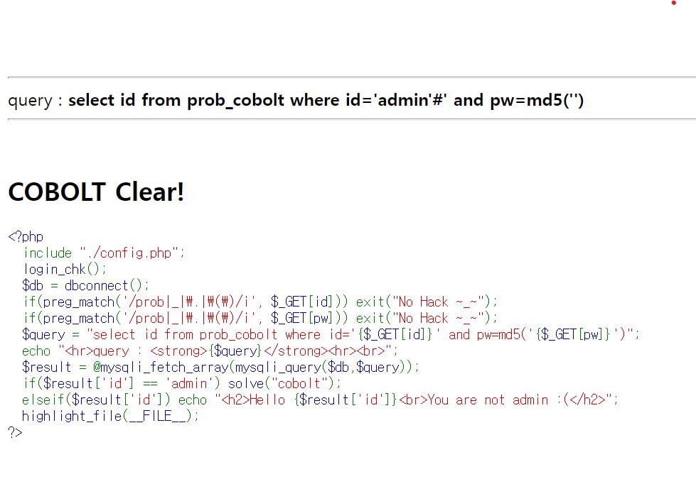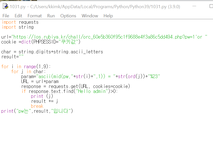 Id 가 존재한다면 Hello Admin이 출력되는 점을 이용하여 id=admin을 주고 뒤에는 패스워드의 길이를 검증하는 페이로드 전송